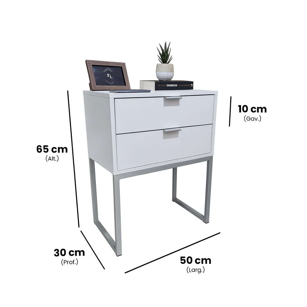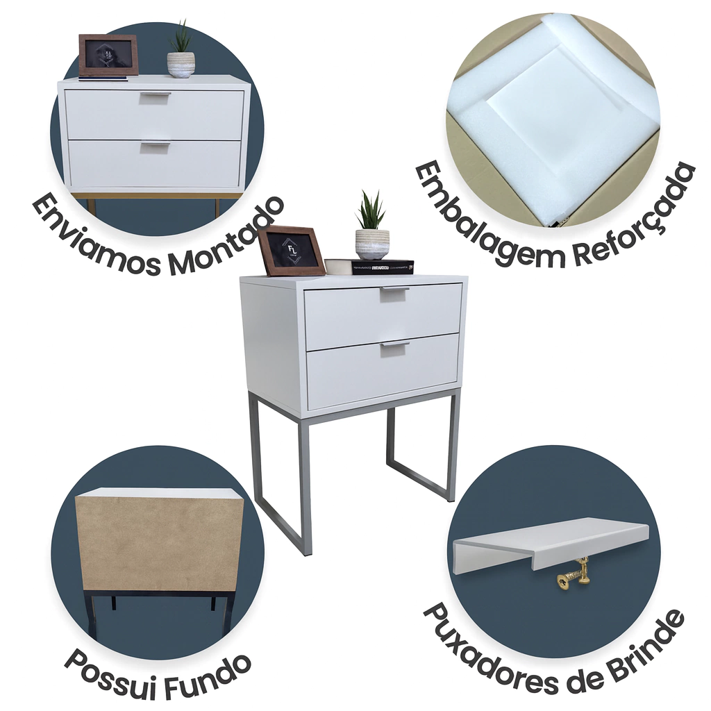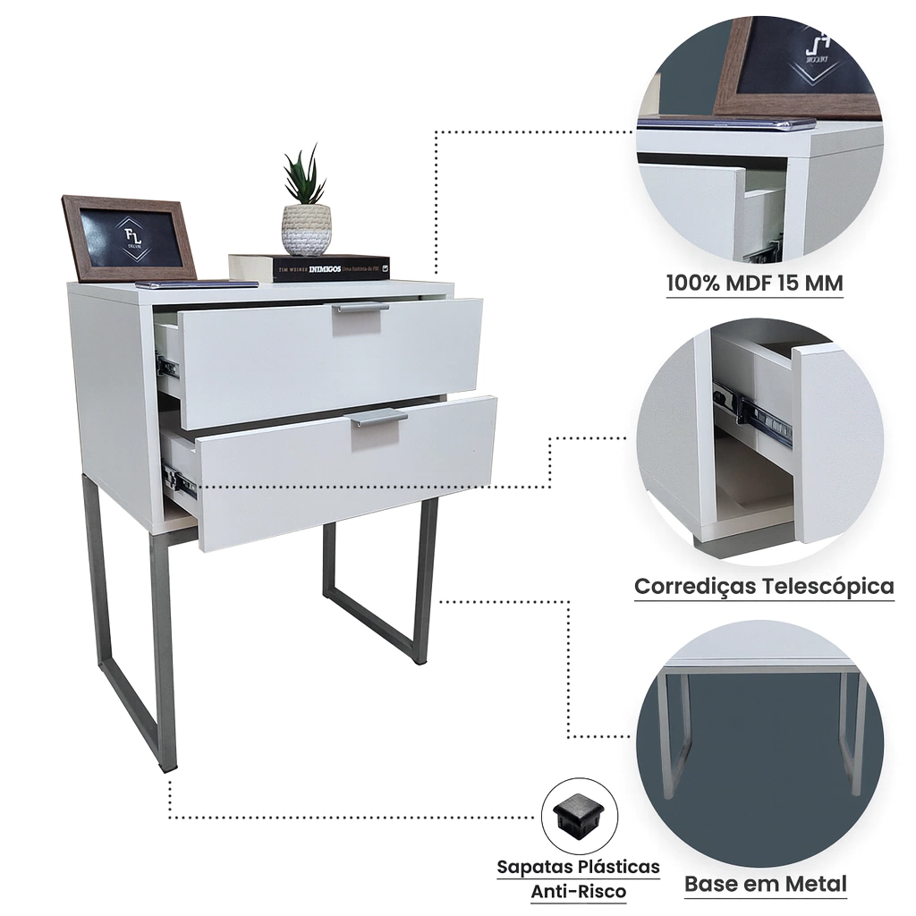 Com 2 gavetas equipadas com corrediças telescópicas e estrutura metálica reforçada, ela garante estilo, resistência e funcionalidade para o seu quarto.