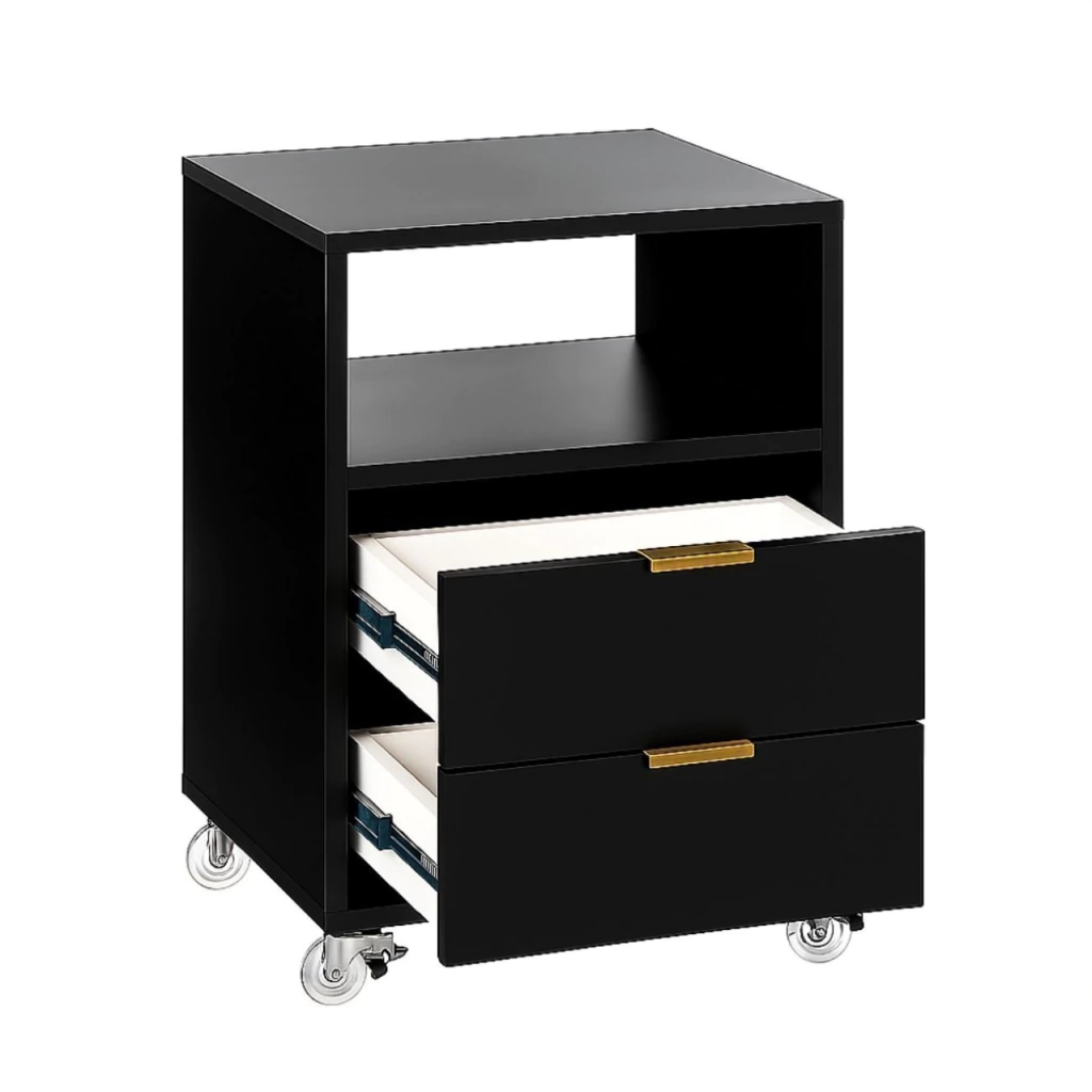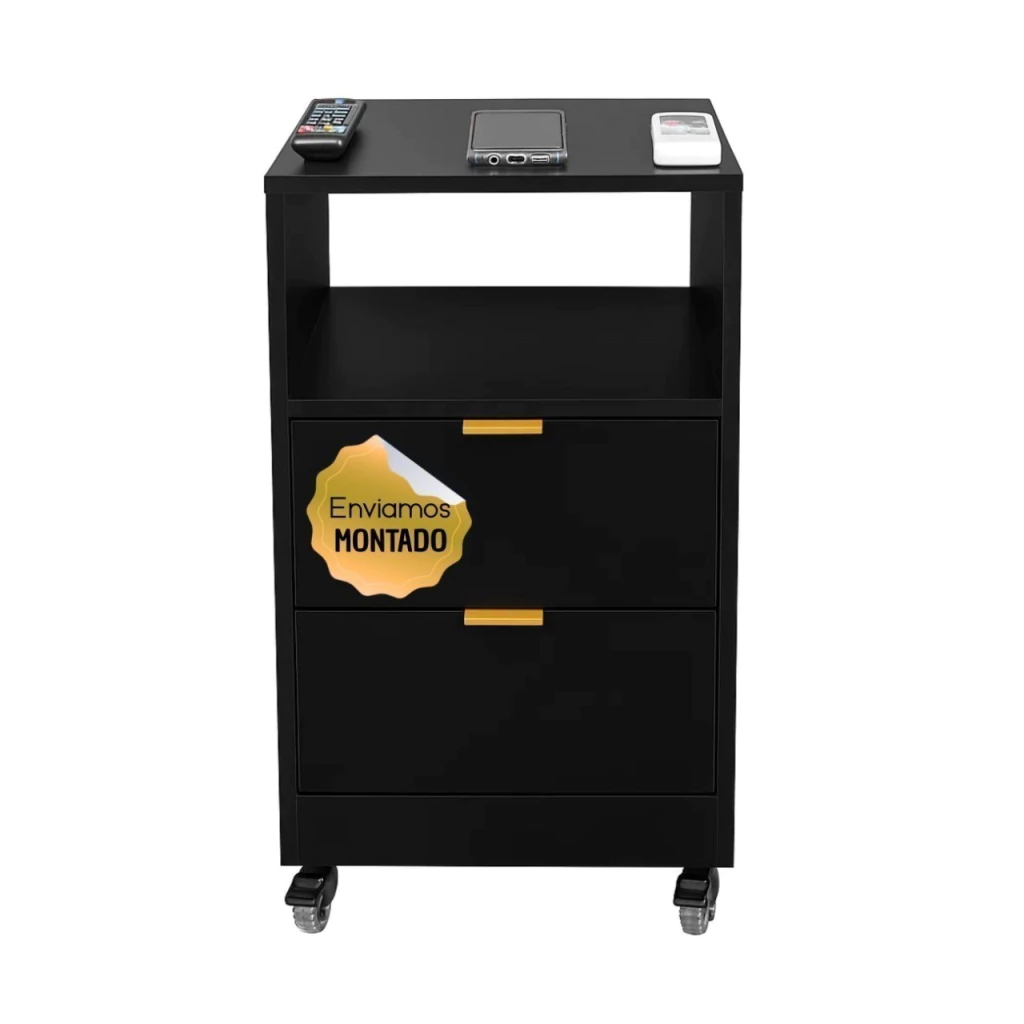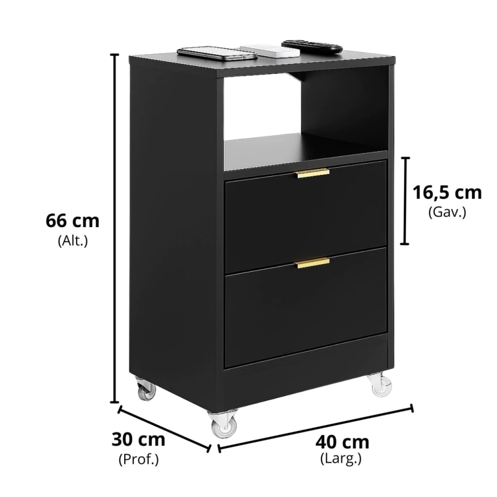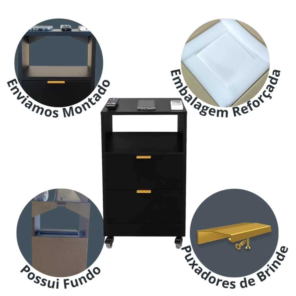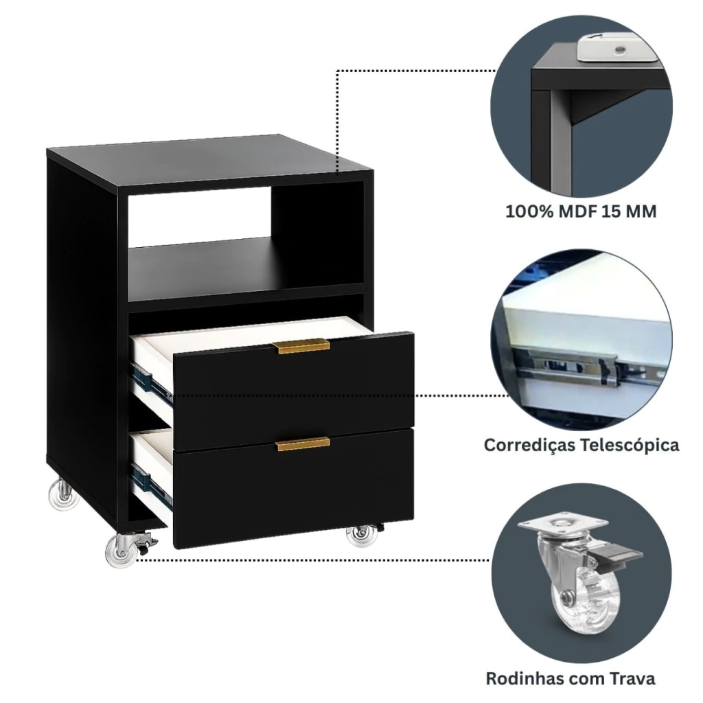 A Mesa de Cabeceira Preta com Rodinhas e 2 Gavetas é prática, resistente e ideal para organização do quarto. Produzida em MDF 15mm, possui corrediças telescópicas, puxadores de brinde e rodinhas com trava que facilitam a mobilidade. Com 66cm de altura, 40cm de largura e 30cm de profundidade, chega montada e com embalagem reforçada, garantindo segurança e praticidade desde a entrega.