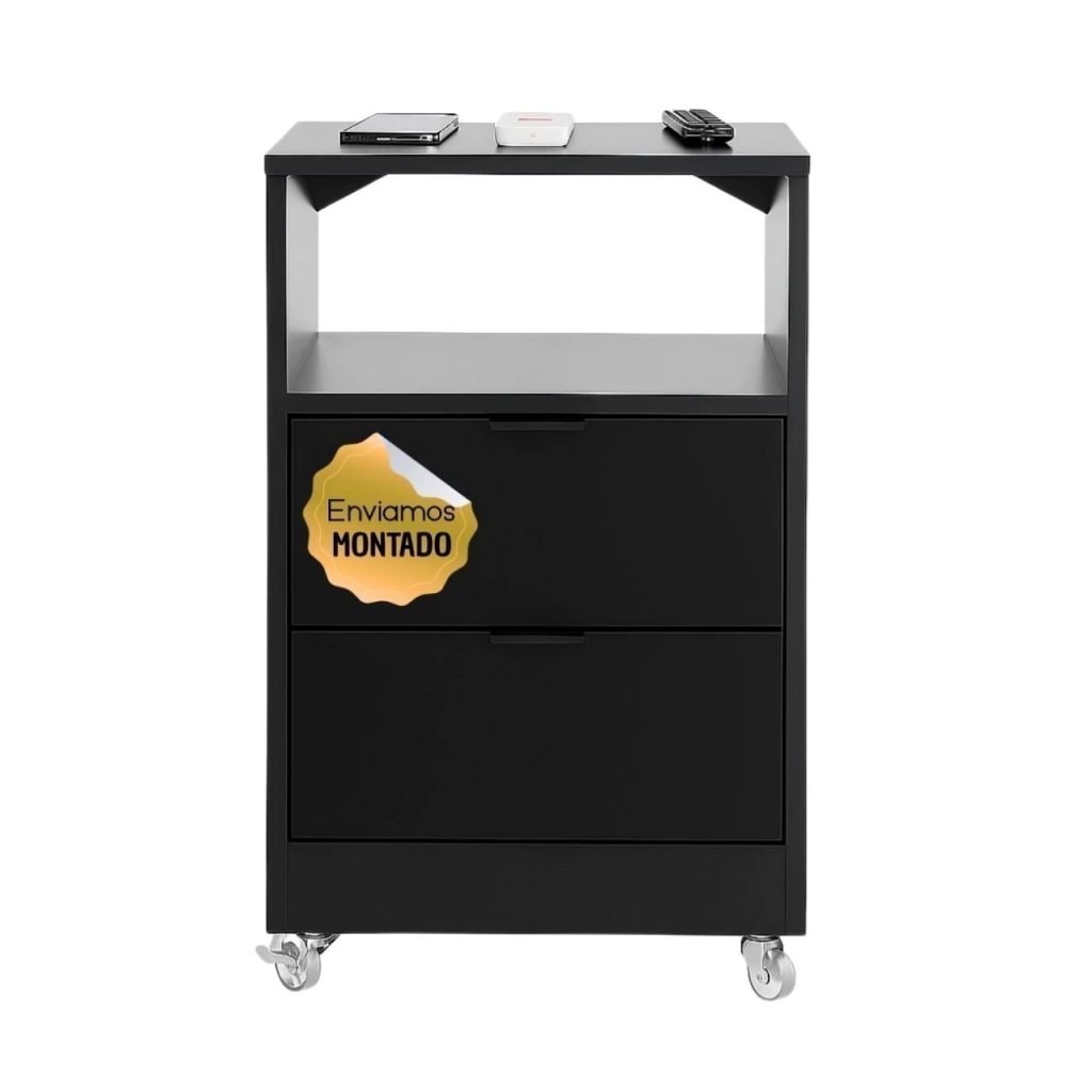 A Mesa de Cabeceira Preta com Rodinhas e 2 Gavetas é prática, resistente e ideal para organização do quarto. Produzida em MDF 15mm, possui corrediças telescópicas, puxadores de brinde e rodinhas com trava que facilitam a mobilidade. Com 66cm de altura, 40cm de largura e 30cm de profundidade, chega montada e com embalagem reforçada, garantindo segurança e praticidade desde a entrega.