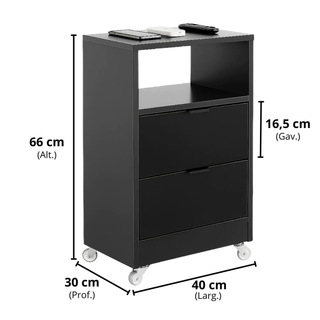 Mesa de Cabeceira com Rodinhas 2 Gavetas em MDF 15mm  – Pronta p/ Uso