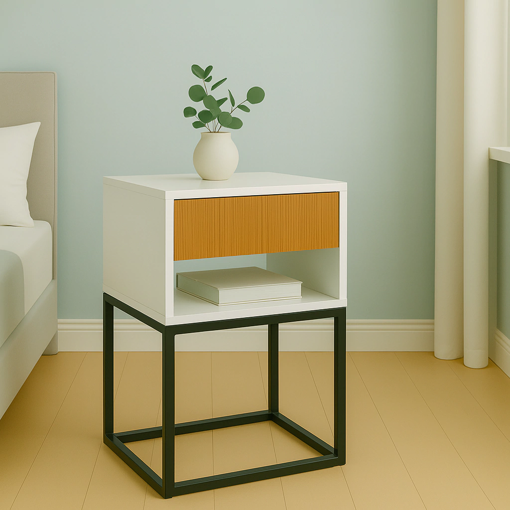 Conta com uma gaveta superior, ideal para armazenar objetos pessoais com praticidade, e um nicho inferior aberto, funcional e decorativo, perfeito para apoiar livros, revistas ou itens de uso diário.
