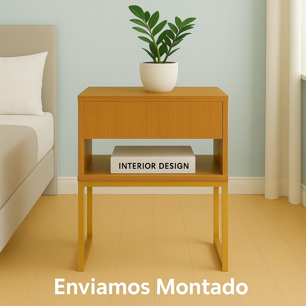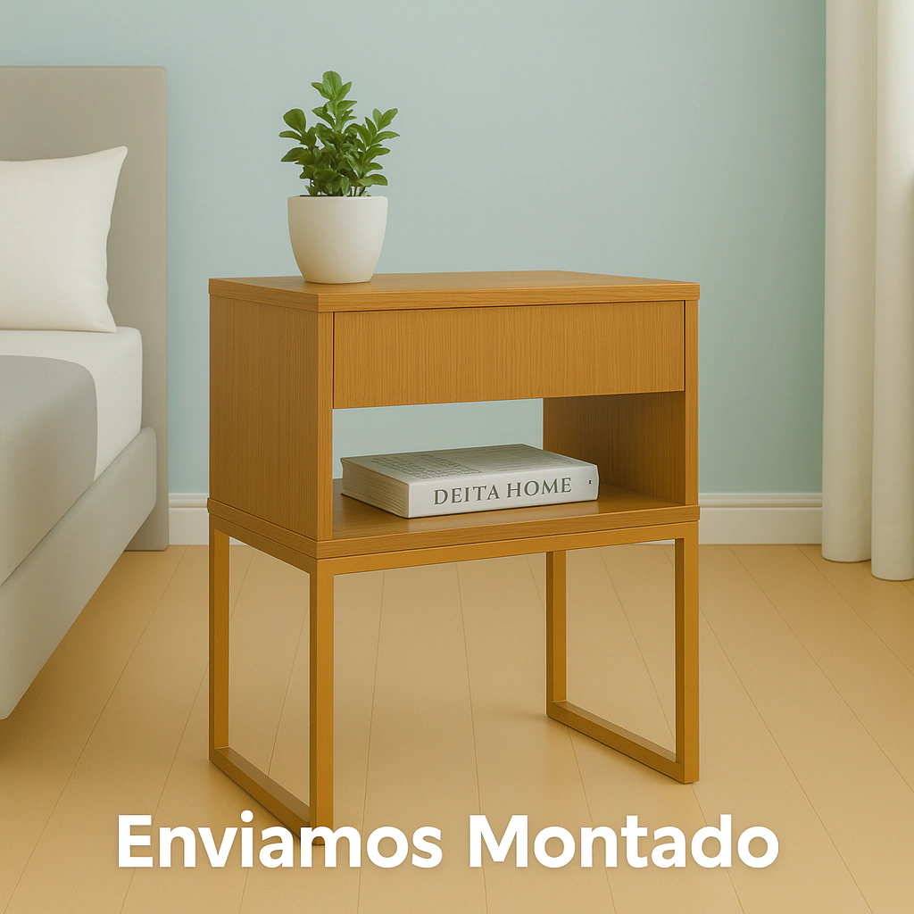 Transforme seu quarto com elegância e funcionalidade! Nossa mesa de cabeceira é a escolha perfeita para quem busca um móvel compacto, sofisticado e prático para o dia a dia. O design moderno valoriza qualquer ambiente, com uma combinação refinada entre o acabamento amadeirado e a base metálica dourada em estilo industrial.