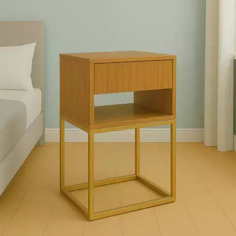 Produzida em MDF de alta qualidade com acabamento totalmente amadeirado, a peça proporciona um visual aconchegante e versátil, que se adapta a diversos estilos de decoração. A base metálica com design industrial na cor dourada é o grande diferencial, trazendo um ar contemporâneo com sofisticação, além de oferecer resistência e durabilidade.