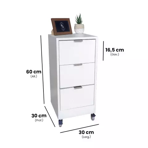 Mesa de Cabeceira Branca 30cm com 3 Gavetas e Rodinhas – Enviada Montada