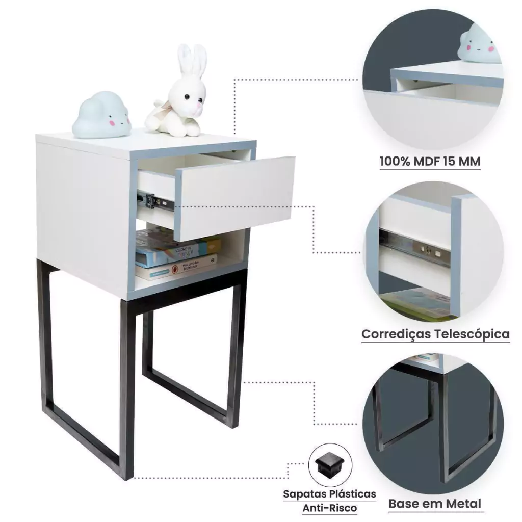 Esta mesa de cabeceira possui uma gaveta espaçosa e um nicho, oferecendo amplo espaço de armazenamento para guardar livros, dispositivos eletrônicos, documentos e outros objetos pessoais. As gavetas deslizam suavemente, proporcionando fácil acesso aos seus pertences.