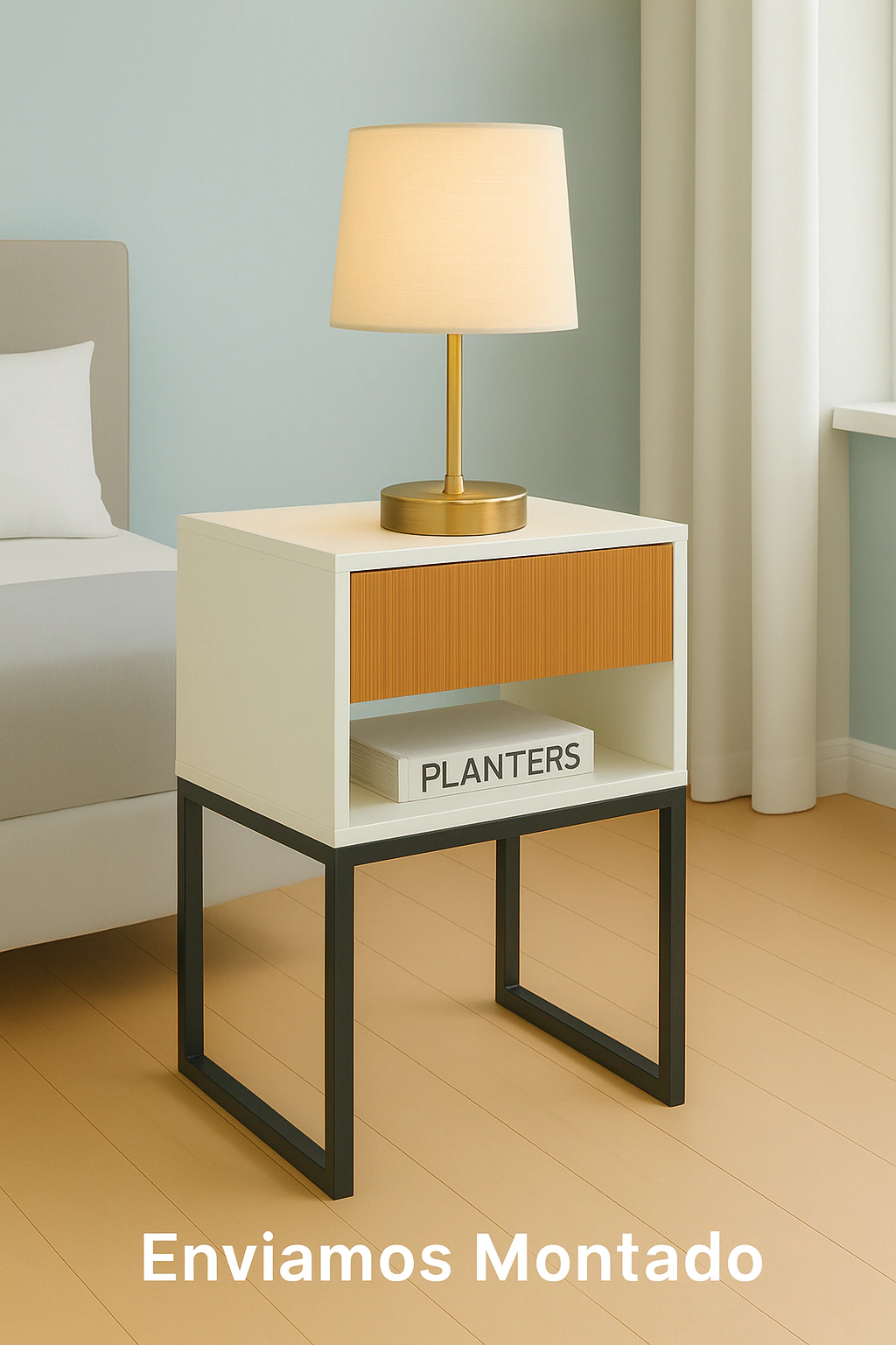 Produzida em MDF de alta qualidade, sua estrutura branca transmite leveza, enquanto a gaveta superior com acabamento amadeirado adiciona um toque sofisticado e acolhedor. A base metálica na cor preta, no estilo industrial, completa o visual com personalidade e modernidade.