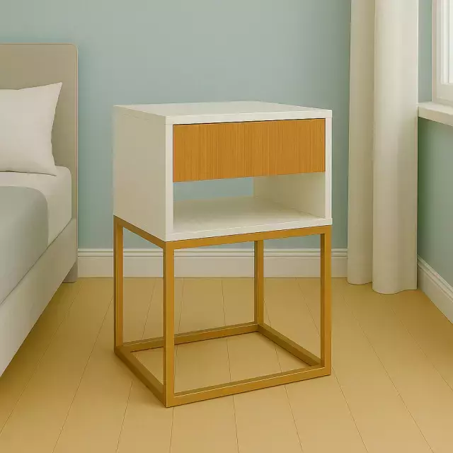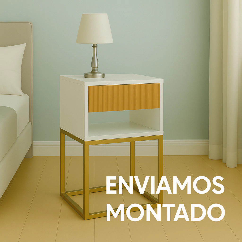 Produzida em MDF de alta qualidade, sua estrutura na cor branca traz leveza e suavidade ao ambiente, enquanto a gaveta com acabamento amadeirado adiciona um toque de sofisticação e contraste visual. O destaque do modelo fica por conta da base metálica com design industrial na cor dourada, que proporciona firmeza, durabilidade e um acabamento refinado.