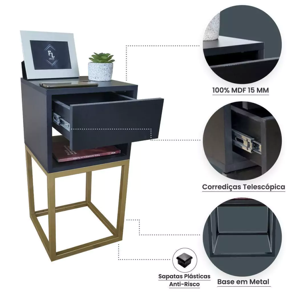 -Enviamos Montado. -Base Feita em Metalon. -Resistente Suportanto até 30kg. -Construída com materiais duráveis e de alta qualidade. -Design moderno e minimalista que se adapta a qualquer decoração. -Gaveta com espaço de armazenamento para manter seu quarto organizado.
