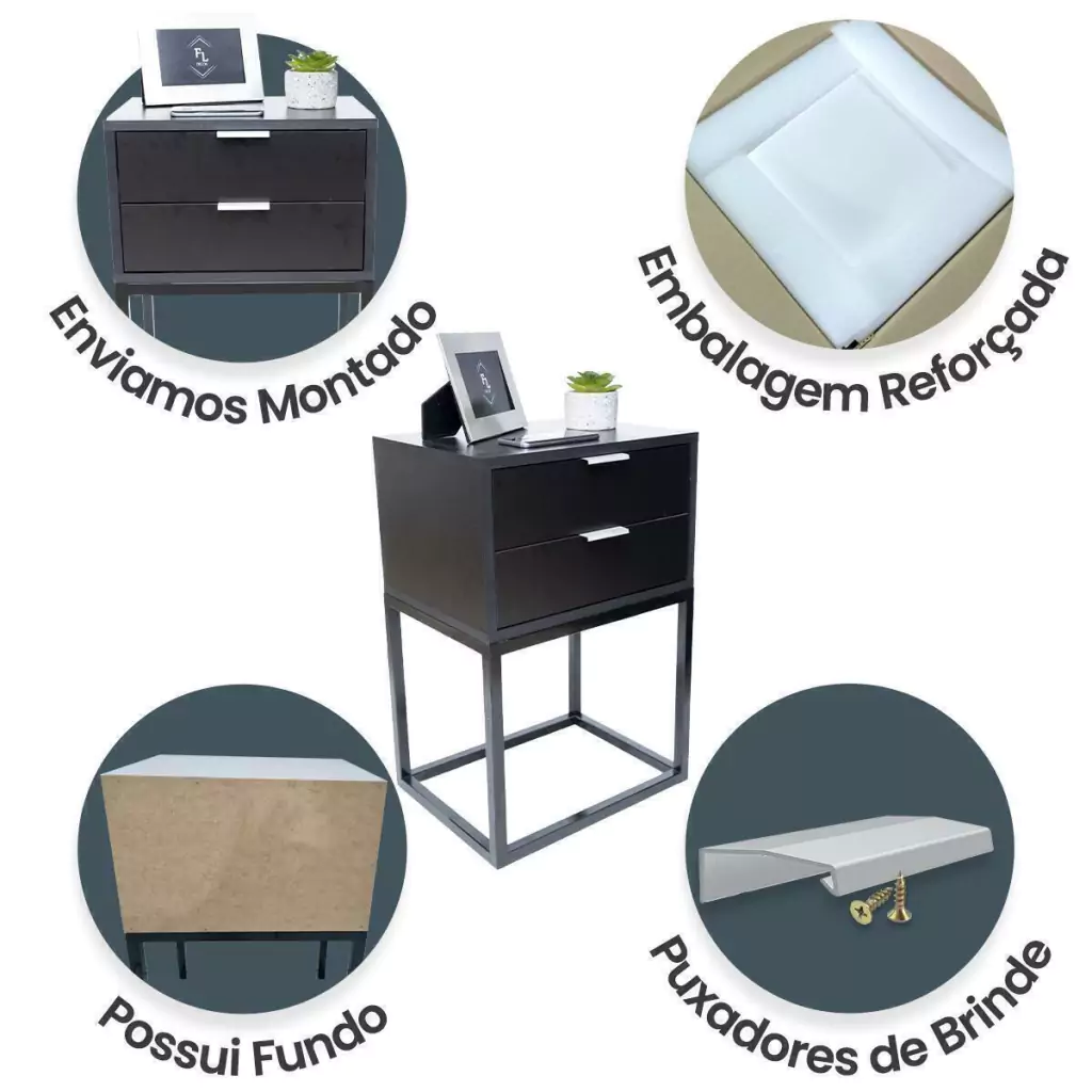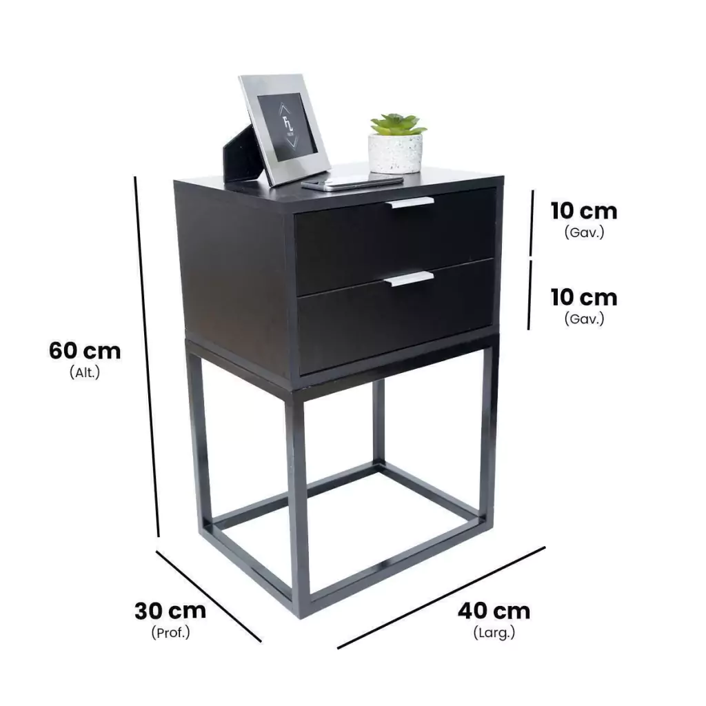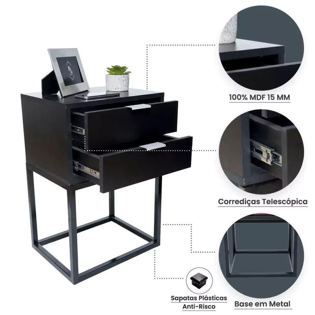 Esta mesa de cabeceira possui gavetas espaçosas, oferecendo amplo espaço de armazenamento para guardar livros, dispositivos eletrônicos, documentos e outros objetos pessoais. As gavetas deslizam suavemente, proporcionando fácil acesso aos seus pertences.