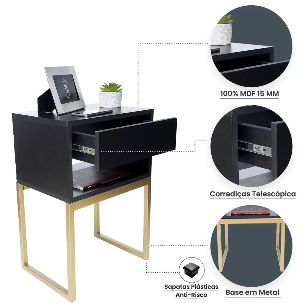 Sua estrutura é feita de metalon, conferindo durabilidade e estabilidade à mesa. Além disso, o metalon recebeu uma pintura, adicionando um toque de sofisticação e glamour ao ambiente.