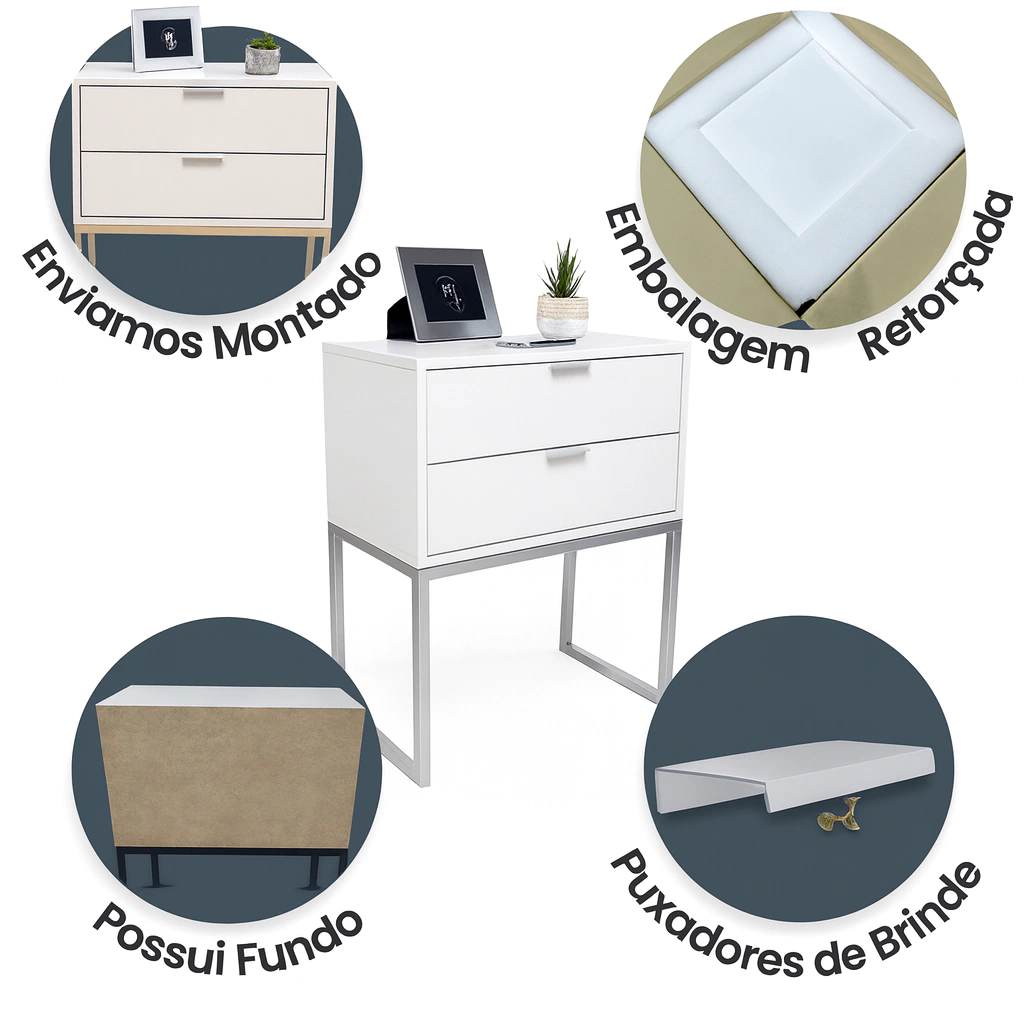 Sua estrutura é produzida em metalon de alta resistência, garantindo estabilidade e durabilidade. A base em prata confere um toque contemporâneo e sofisticado, enquanto os puxadores pratas harmonizam perfeitamente com o design, criando um visual elegante e atemporal.