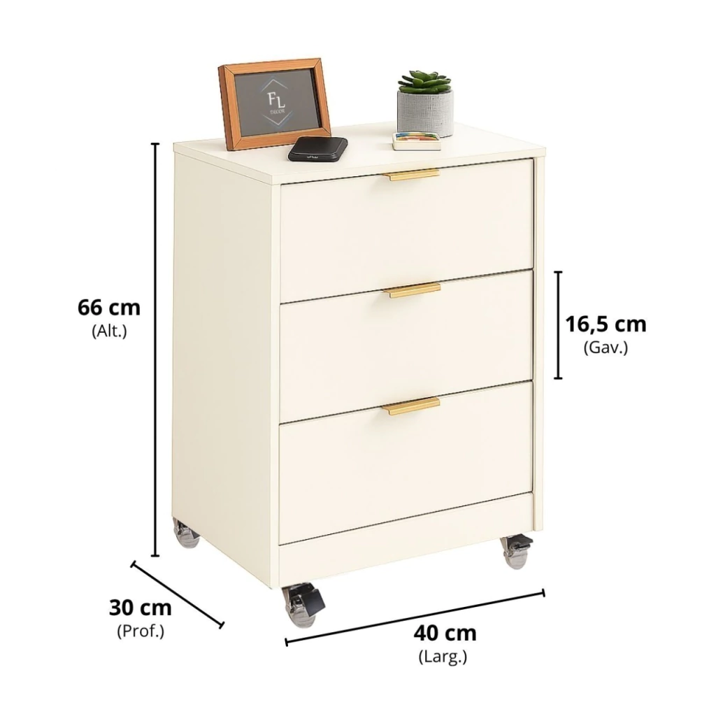 Mesa de Cabeceira Off White 40cm com 3 Gavetas, Rodinhas e Puxadores Dourados – Enviada Montada | FL Decor