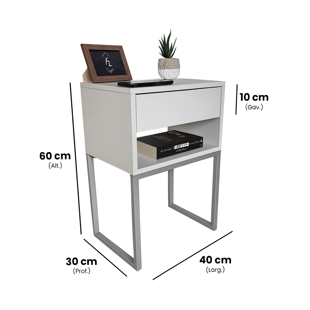 1 gaveta + nicho aberto: mais espaço para organizar objetos pessoais, livros, celular ou acessórios.