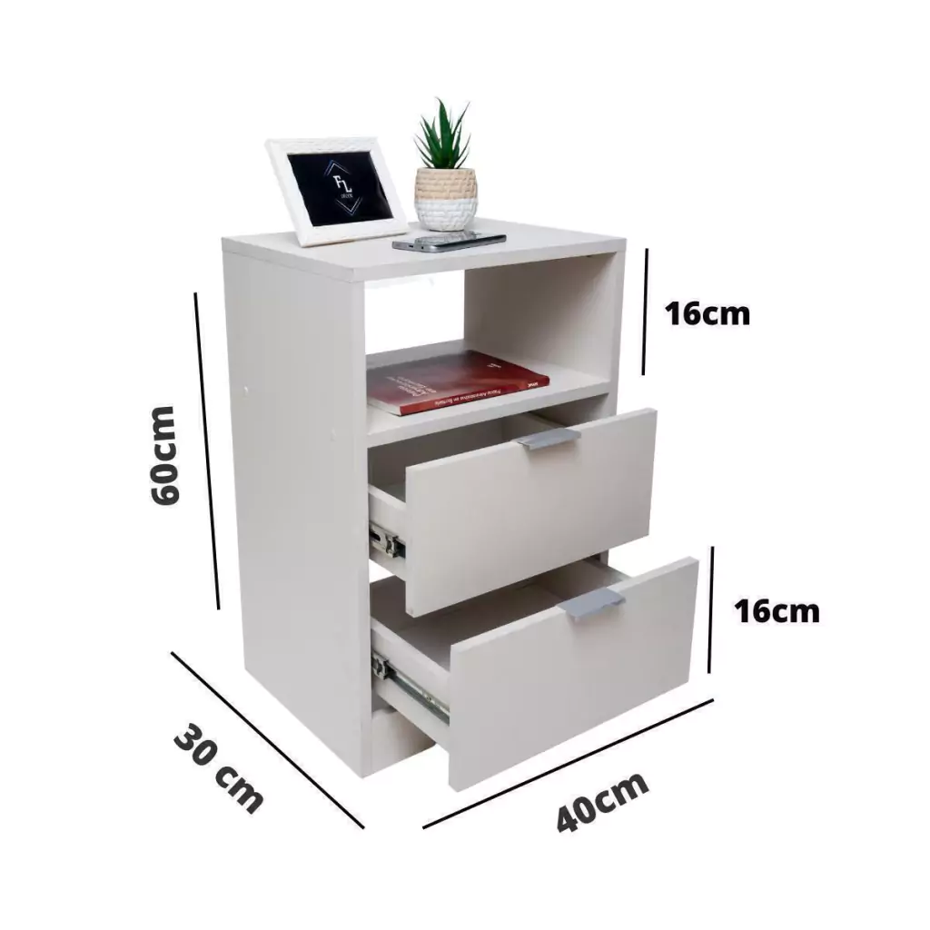A mesa de cabeceira tem um tamanho ideal para acomodar seus pertences pessoais. Ela possui duas gavetas espaçosas, perfeitas para guardar seus objetos de valor, livros ou qualquer outro item que você queira manter por perto. Além disso, a mesa de cabeceira também possui um nicho, proporcionando um espaço extra para armazenamento ou decoração.