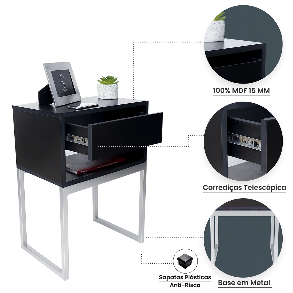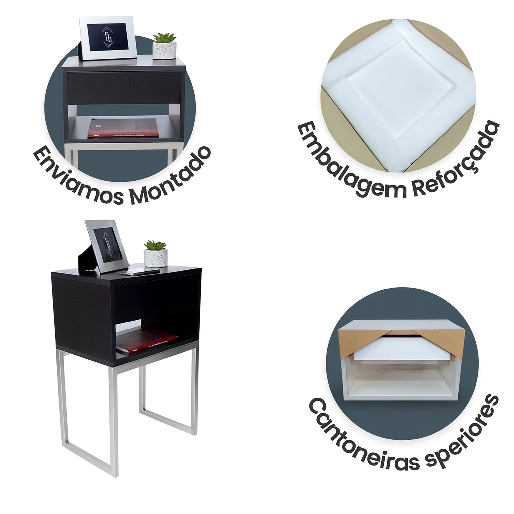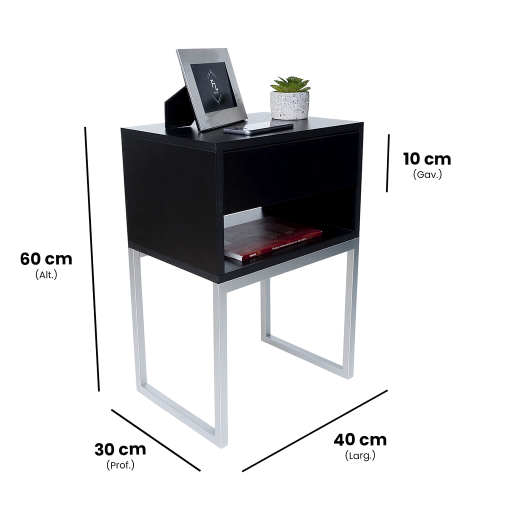 1 gaveta + nicho aberto: organização prática para objetos pessoais, livros, celular e acessórios.