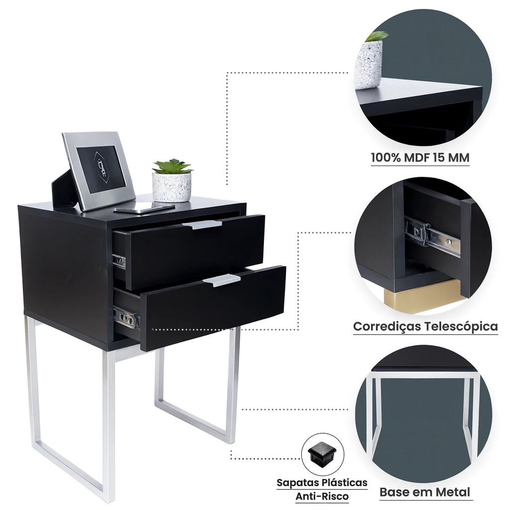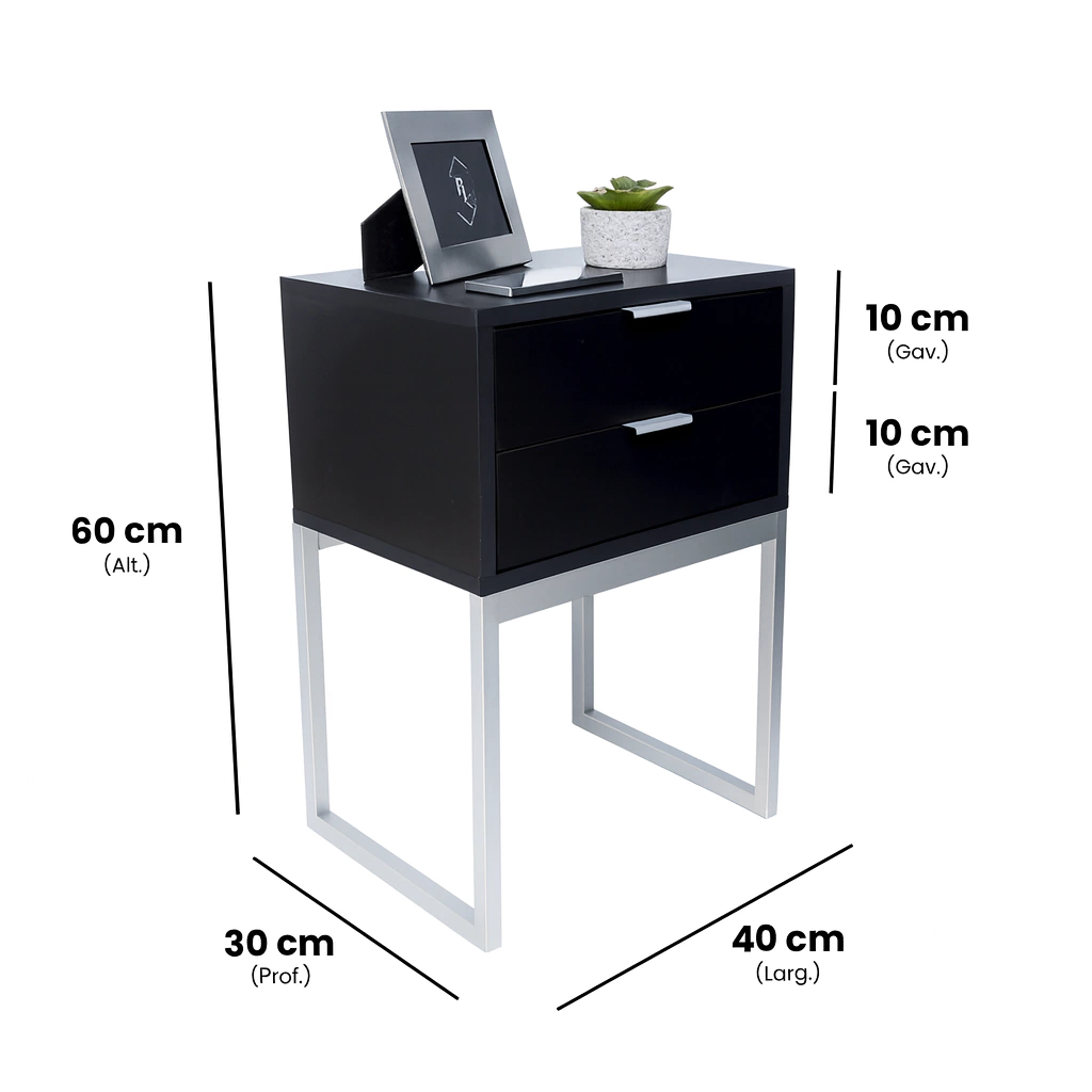 Transforme o visual do seu quarto com a Mesa de Cabeceira Preta 40cm MDF 2 Gavetas, desenvolvida para oferecer organização, praticidade e estilo moderno em um único móvel.